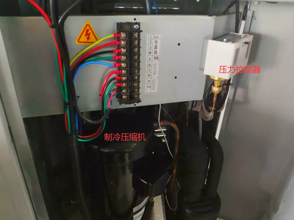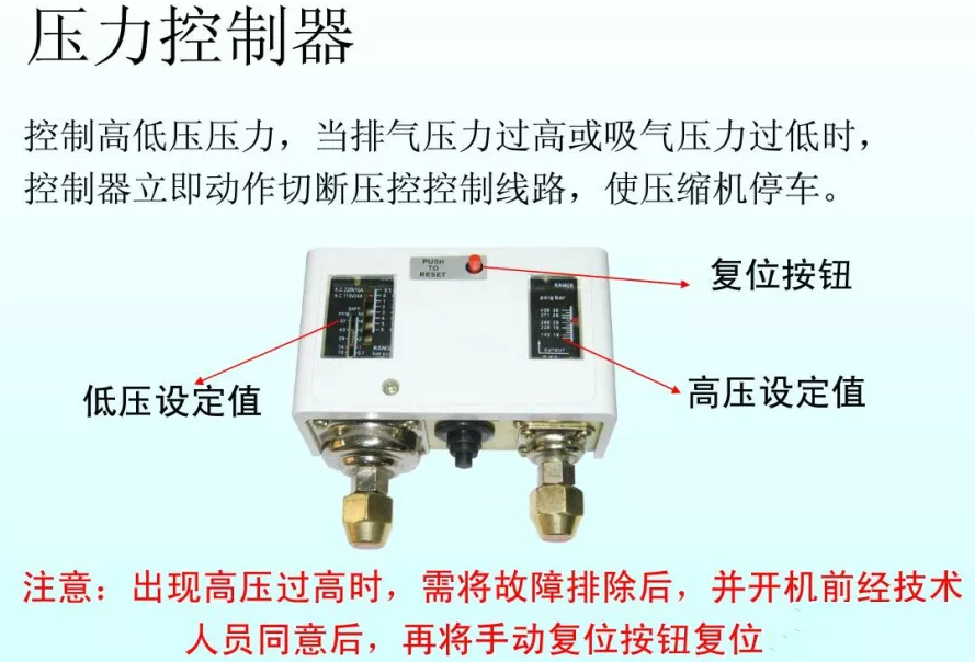 低壓壓力控制器,用于控制低壓壓力或者吸氣壓力。當系統缺少制冷劑,或者遇堵塞、忘開閥門,或者熱負荷過低及其它原因導致低壓過低時,控制器起跳,斷開接觸器的電路,使壓縮機停機保護壓縮機不在過低壓力下運轉,提高系統運行的經濟性。