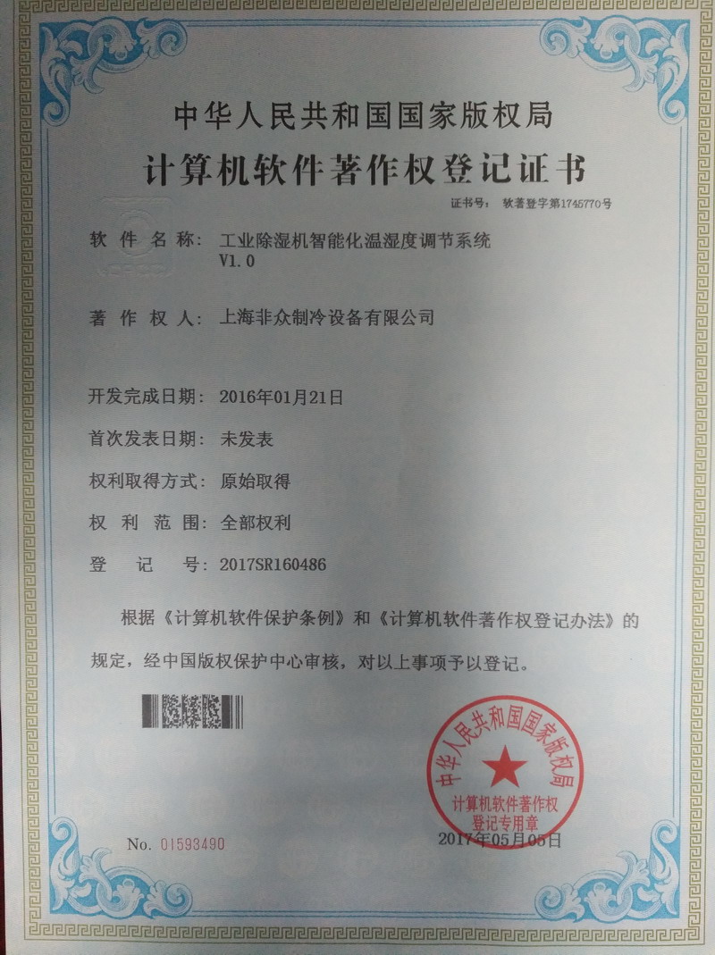 眾有實業資訊:上海眾有實業有限公司旗下子公司上海非眾制冷設備有限公司全新工業除濕機產品榮獲中華人民共和國國家版權局計算機軟件著作權登記證書!
