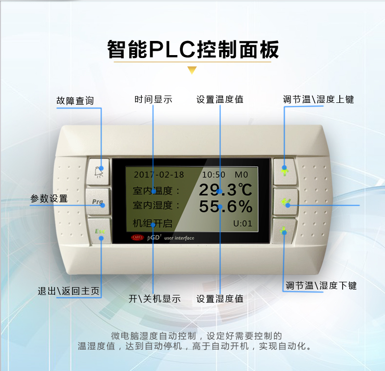 根據室內溫濕度的設計要求,實時檢測室內的溫濕度、室外溫度和系統的運行狀態,根據室內溫濕度的變化和室外溫度條件,自動轉換系統的運行模式,以保證室內的溫濕度要求和系統安全運行。